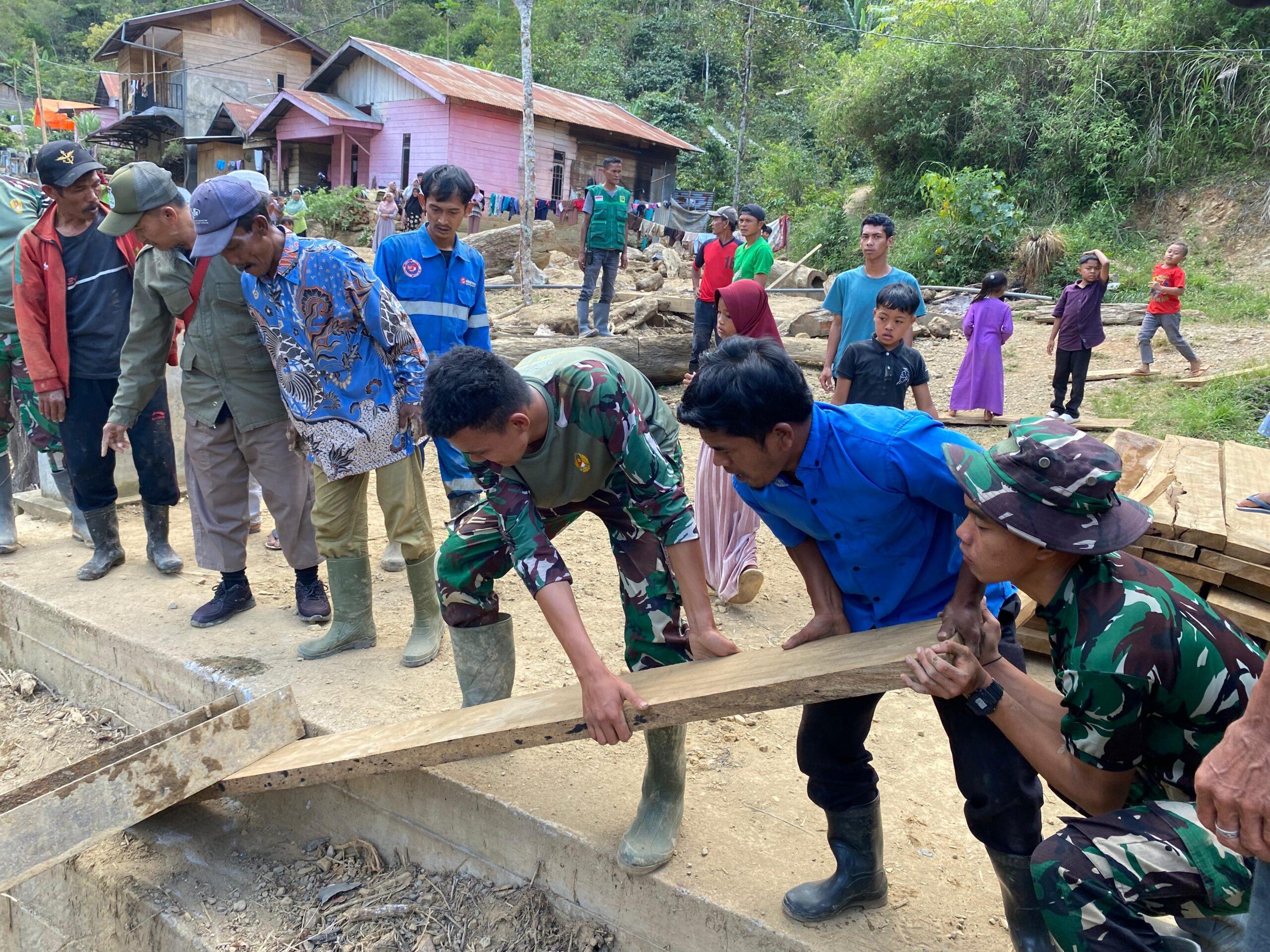 Aceh Tengah — Semangat kebersamaan antara TNI dan masyarakat kembali terlihat dalam pembangunan jembatan darurat di Desa Termiara, Kecamatan Rusip Antara, Kabupaten Aceh Tengah. Anggota Koramil 08/Silih Nara Kodim 0106/Aceh Tengah bersama personel Yonif TP 854/Dharma Kersaka dan warga setempat bergotong royong membangun jembatan sebagai solusi sementara untuk memulihkan akses penghubung antar dusun, Minggu (1/2/2026).