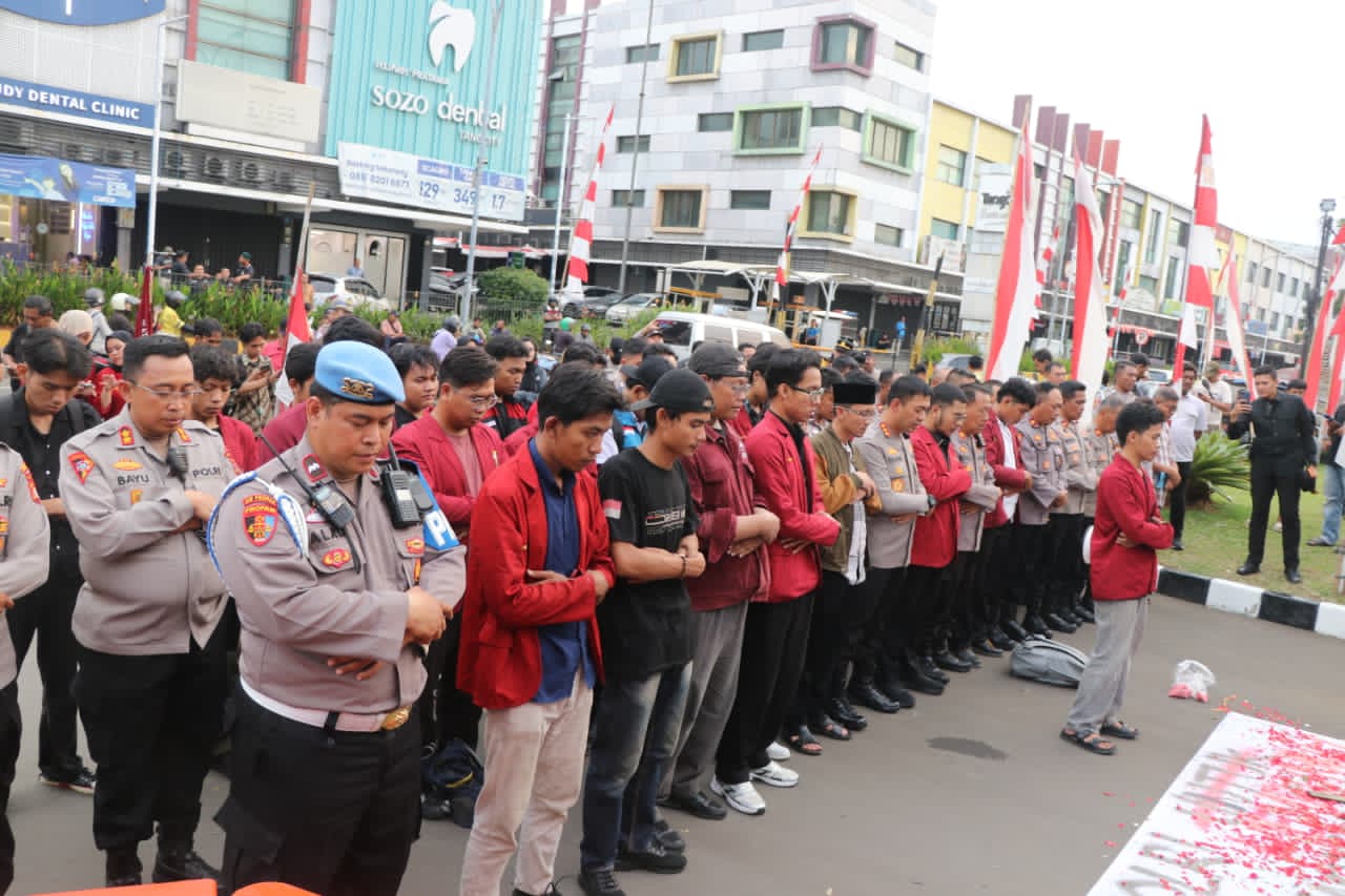 Aksi demontrasi depan Polres Metro Tangerang Kota yang di lakukan oleh Ikatan Mahasiswa Muhammadiyah (IMM) Institut Teknologi Bisnis Ahmad Dahlan (ITB AD) Karawaci, sebelum membubarkan diri bapak Kapolres Metro Tangerang Kota bersama ketua IMM menandatangani Fakta Integritas dan melanjutkan Shalat Ghoib Bersama sama sebagai bentuk solidaritas atas kepergian Affan dan di tutup oleh do’a bersama.