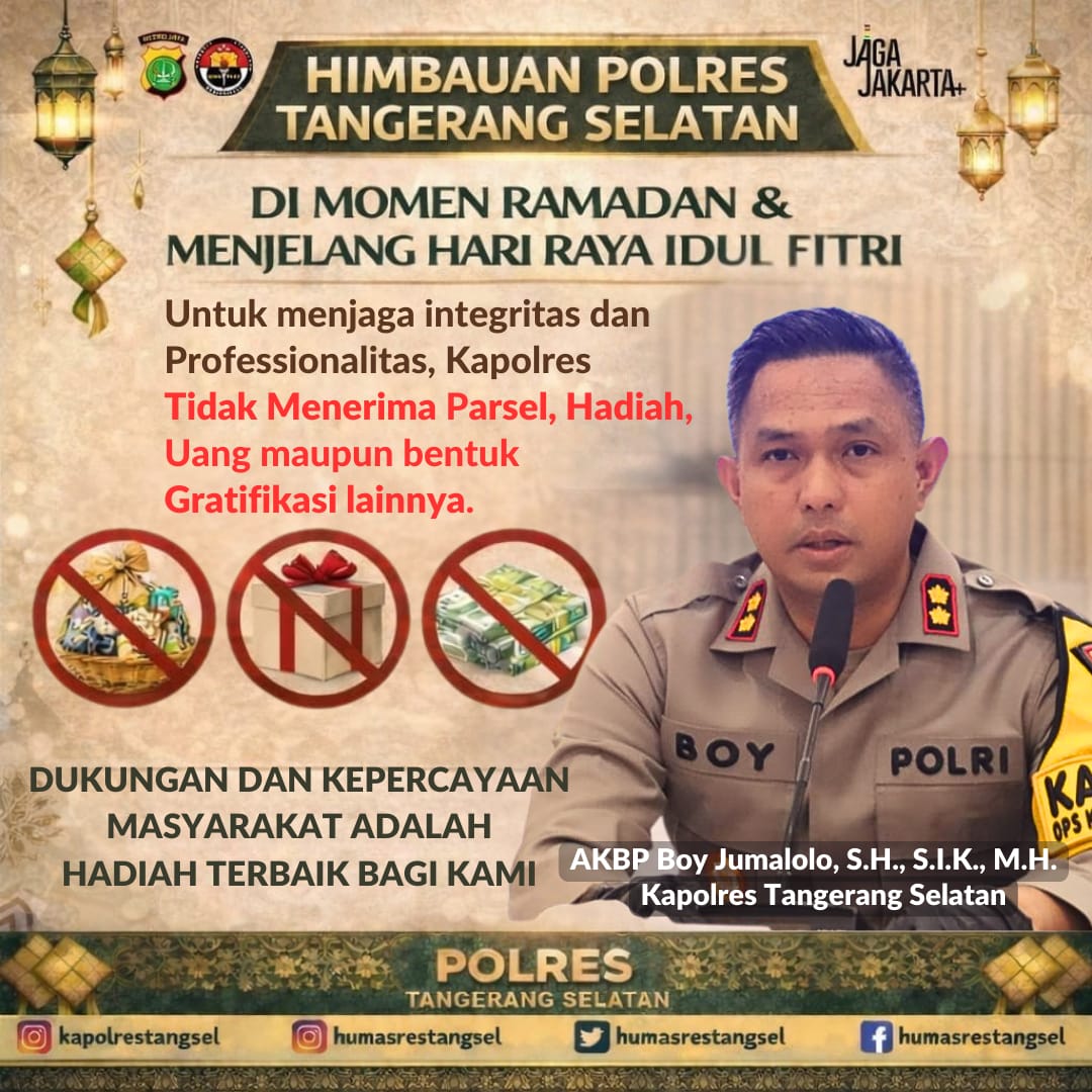 Tang sel – kapolres Tang Sel Akbp Boy Jumalolo meminta seluruh jajaran Untuk Menjaga Integritas dan Profesionalitas, Tidak Menerima parsel, Hadiah, Uang maupun Bentuk Gratifikasi Lainnya tunjangan Hari Raya ( THR ) Idul fitri 2026.