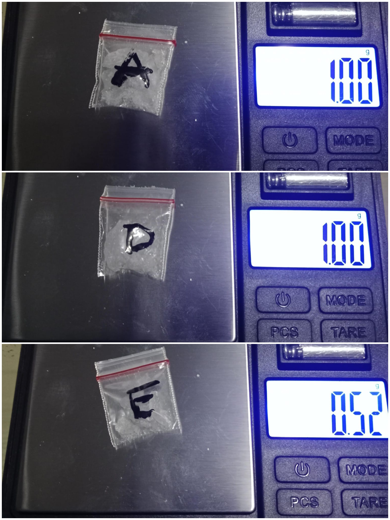 Saat dilakukan penggeledahan, pelaku kedapatan menggenggam lima paket sabu siap edar di tangan kanannya. Saat diinterogasi di tempat, pelaku mengakui bahwa barang tersebut miliknya dan akan diedarkan di sekitar Kalideres.